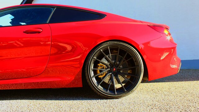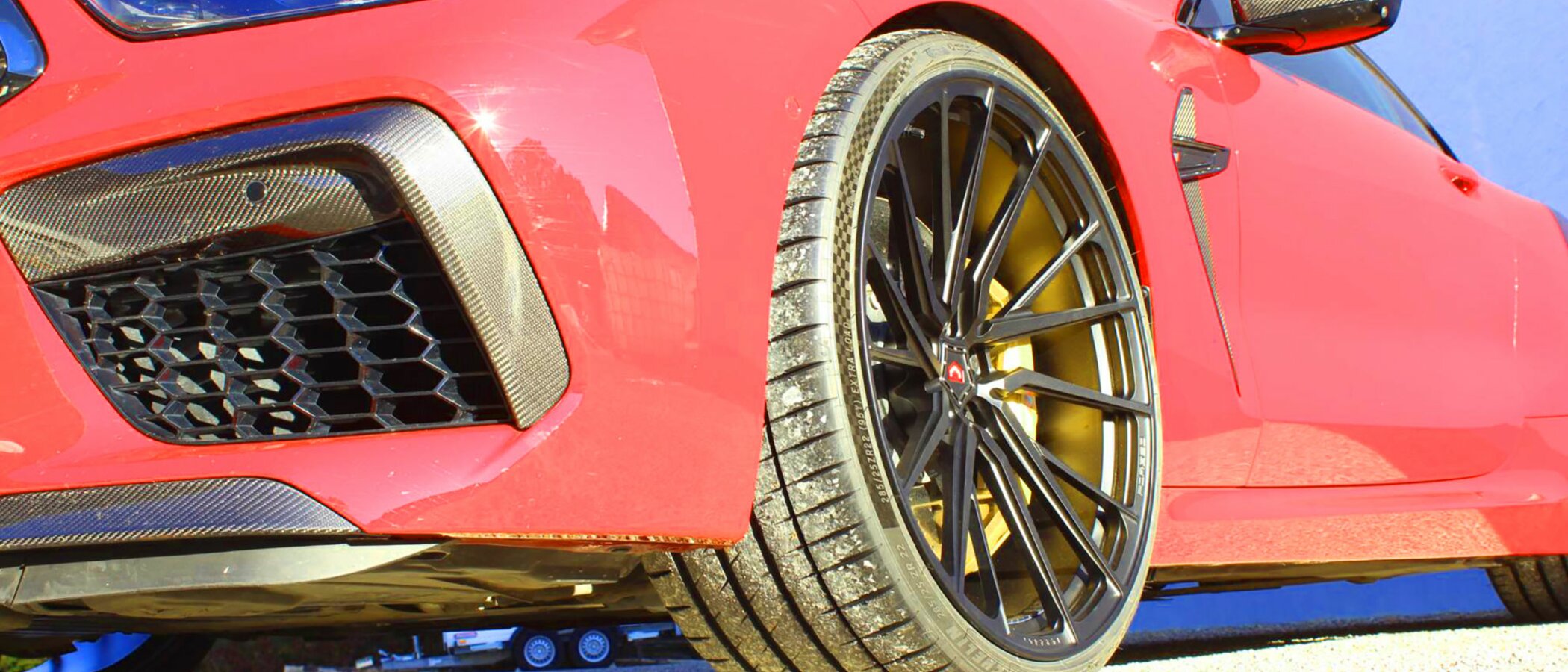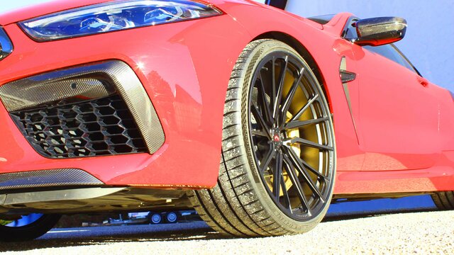 Vorne 10,5x22 mit 285/25ZR22 Michelin Pilot Sport 4S und hinten 11,0x22 mit 295/25ZR22 Michelin Pilot Sport 4S.
