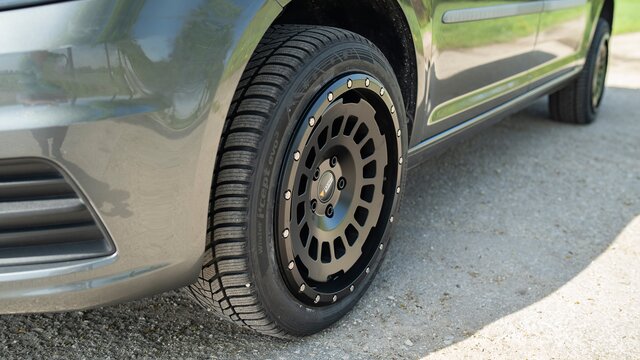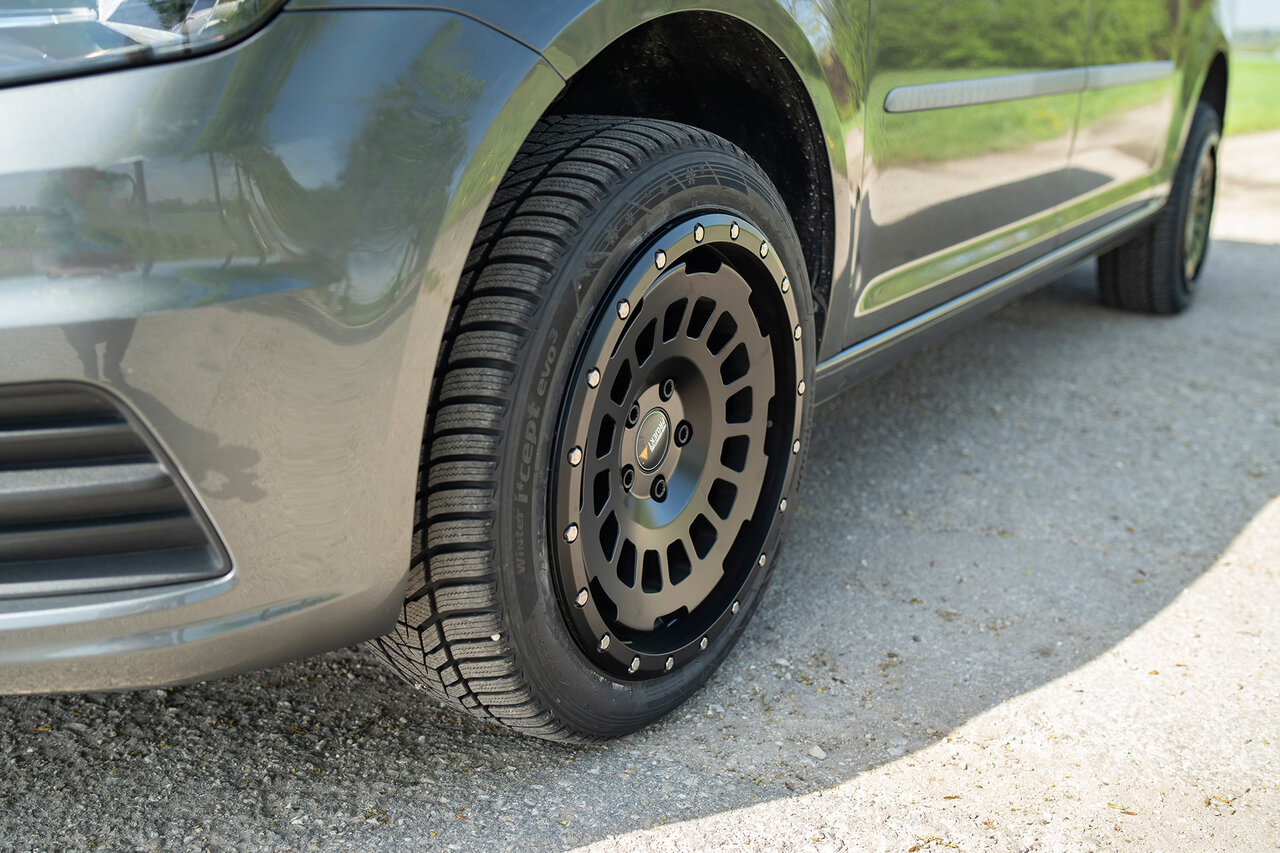 Dieser Caddy wurde mit 8,0x17 Twin Monotube AT 17 Zoll Felgen in Verbindung mit 235/45R17 Bereifung ausgestattet.